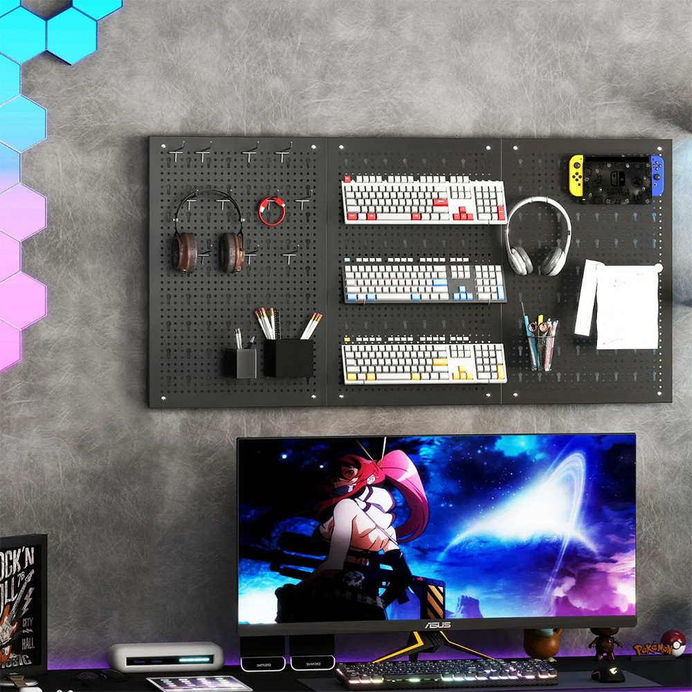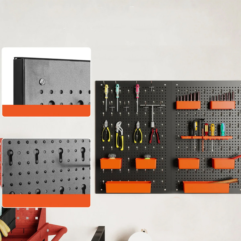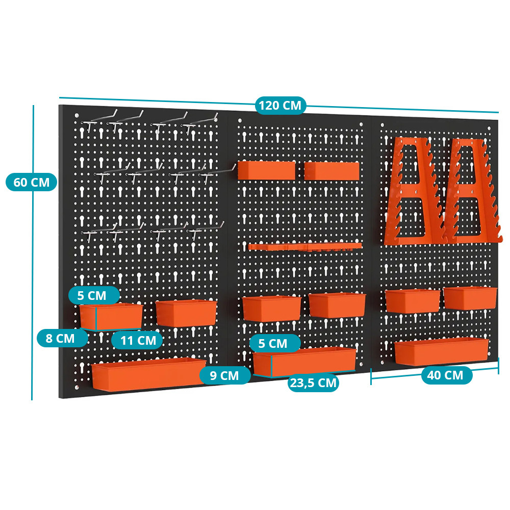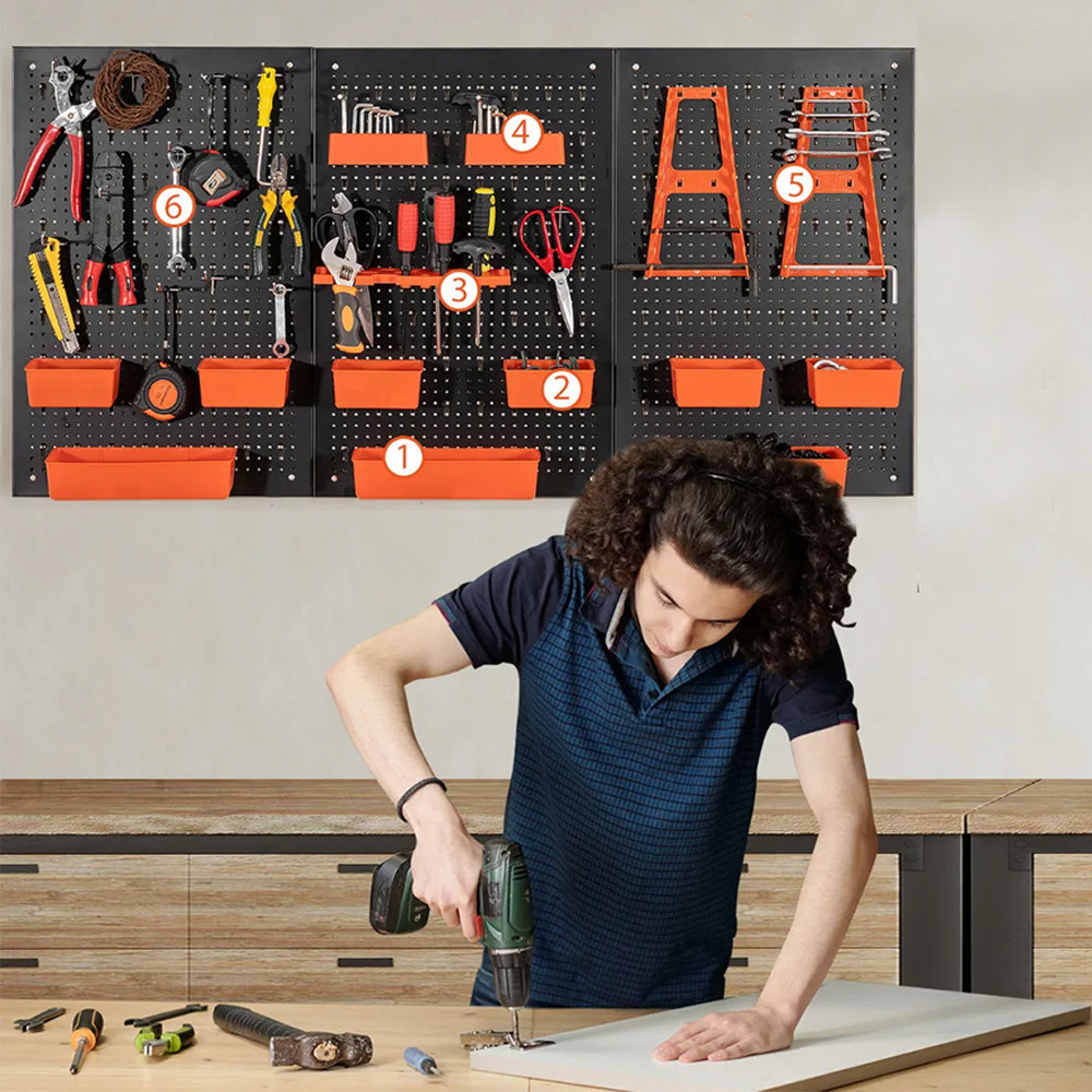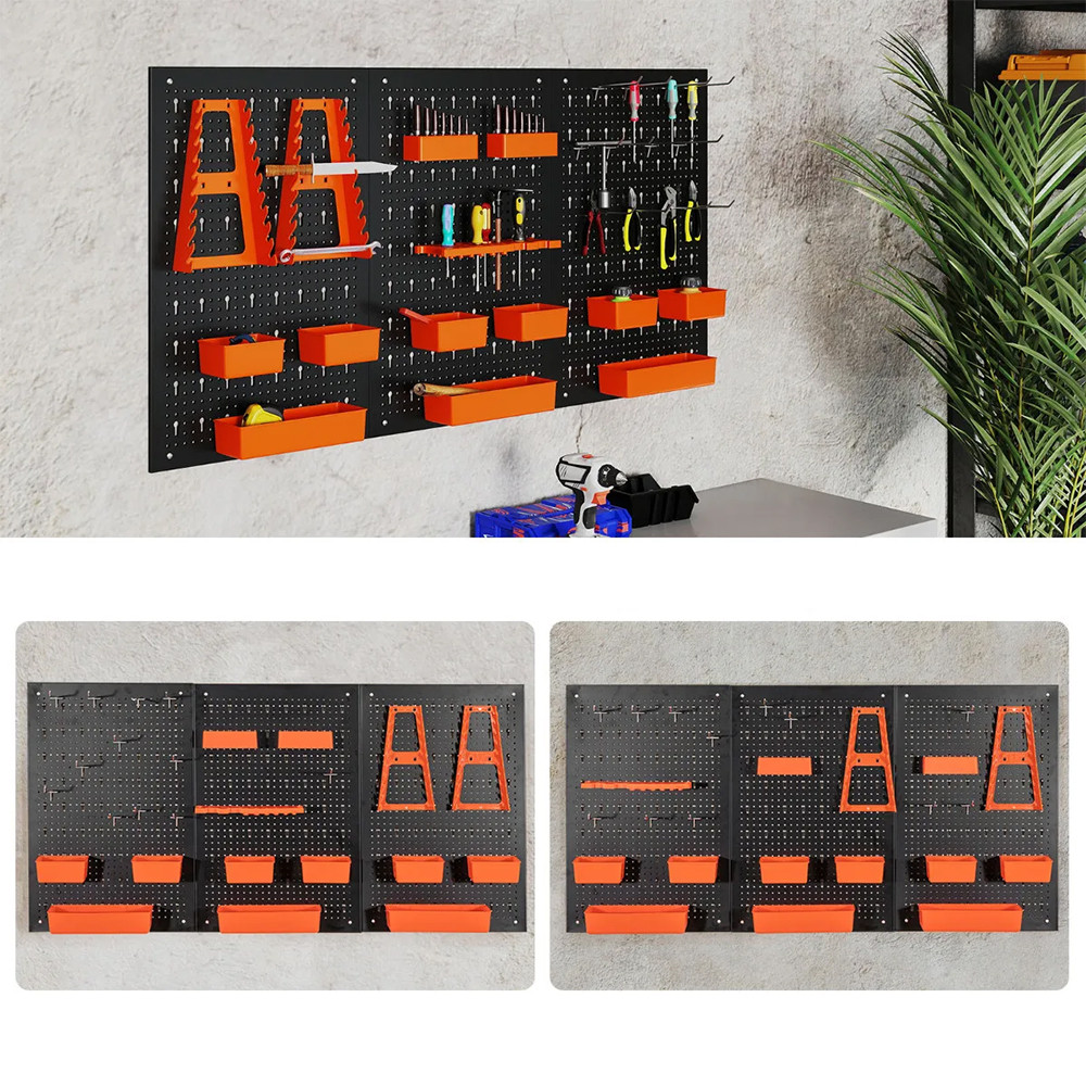 Pravidelně rozmístěné otvory vám umožňují uspořádat přihrádky, háčky a držáky podle potřeby. Klíče, šroubováky, vrtáky a menší nástroje si zde najdou své místo.