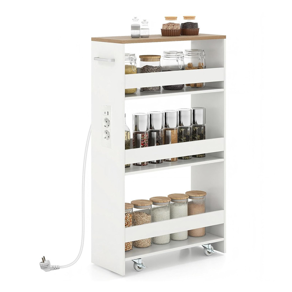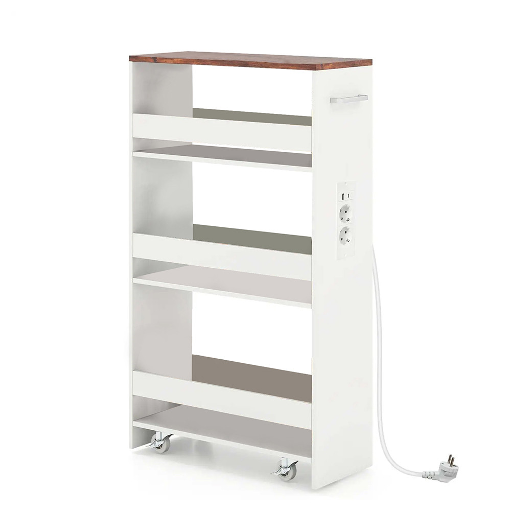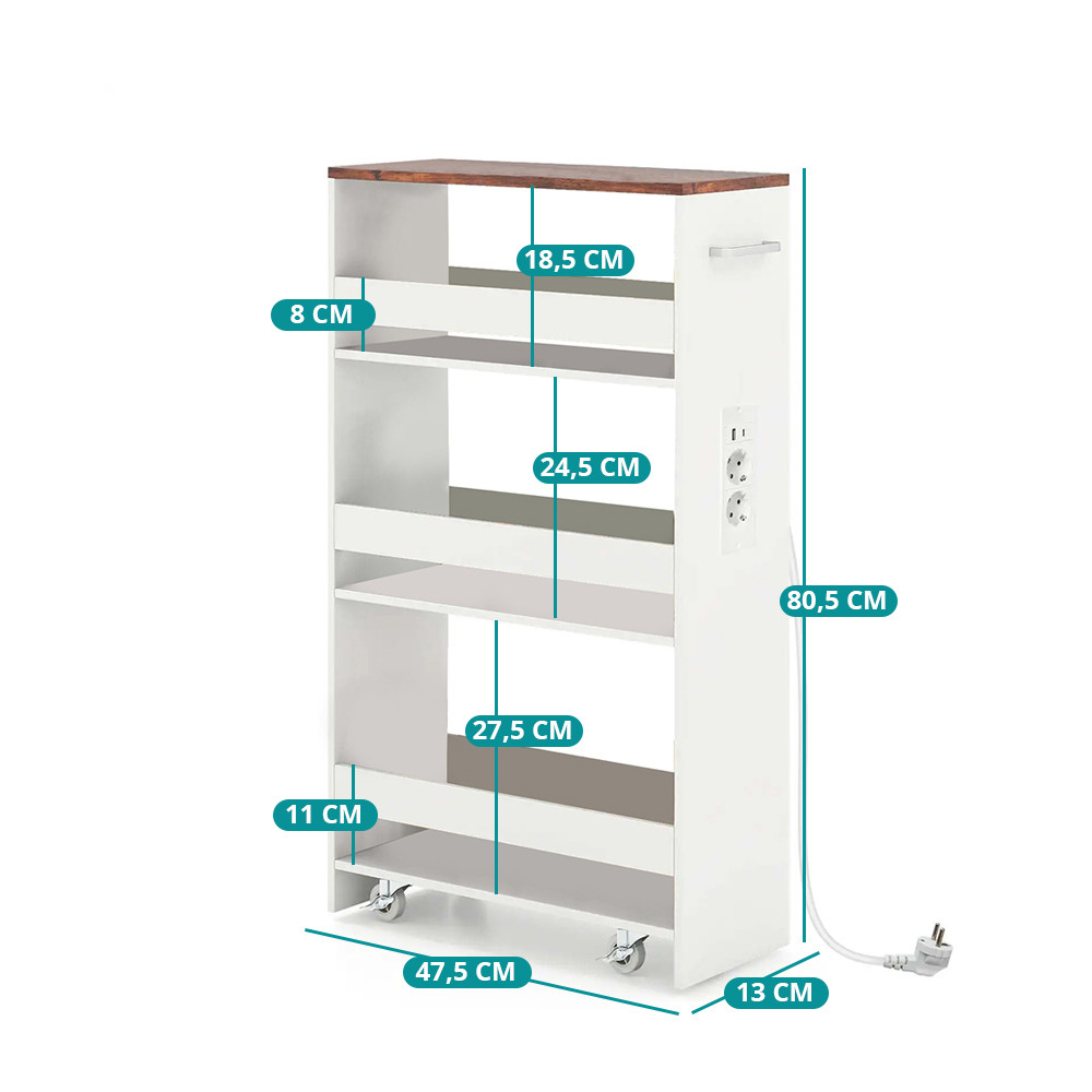 4patrový úložný vozík s integrovanou nabíjecí stanicí je ideálním řešením pro praktické využití úzkých prostor ve vašem domově. Tento úzký vozík se snadno vejde vedle pračky nebo do kuchyně a umožní přehledně uložit každodenní potřeby i pohodlně nabíjet vaše zařízení.