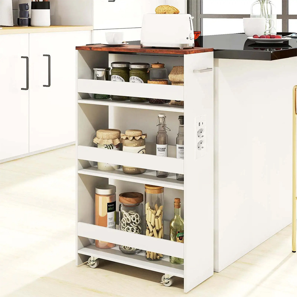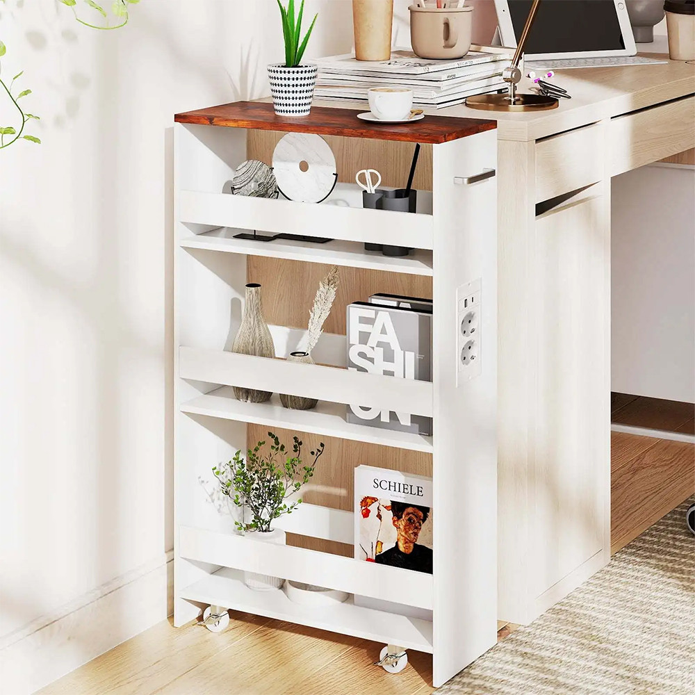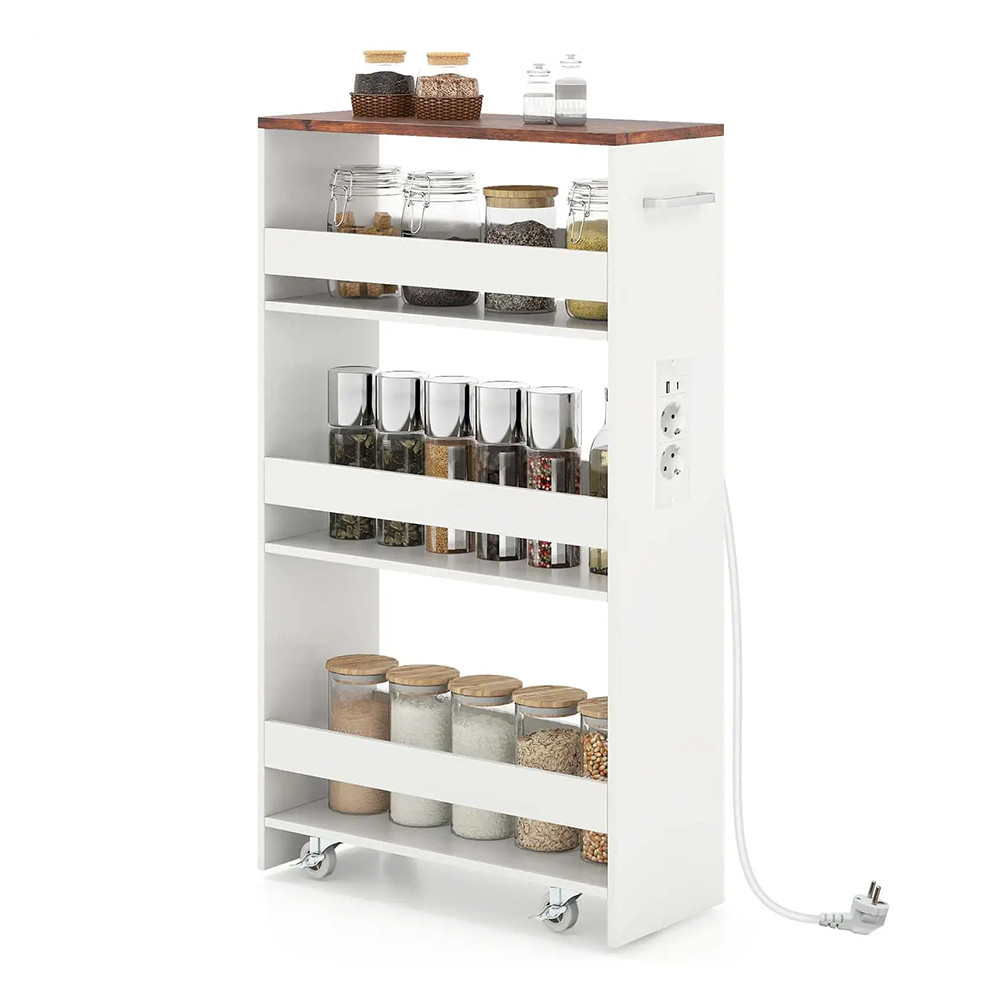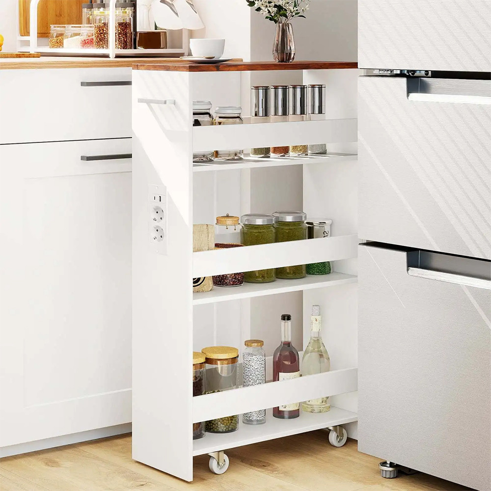 4patrový úložný vozík s integrovanou nabíjecí stanicí je ideálním řešením pro praktické využití úzkých prostor ve vašem domově. Tento úzký vozík se snadno vejde vedle pračky nebo do kuchyně a umožní přehledně uložit každodenní potřeby i pohodlně nabíjet vaše zařízení.