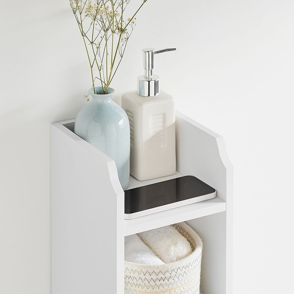 Tato koupelnová skříňka, široká pouze 18 cm, zabírá málo místa, ale poskytuje dostatek prostoru pro toaletní potřeby, čisticí prostředky nebo náhradní role.