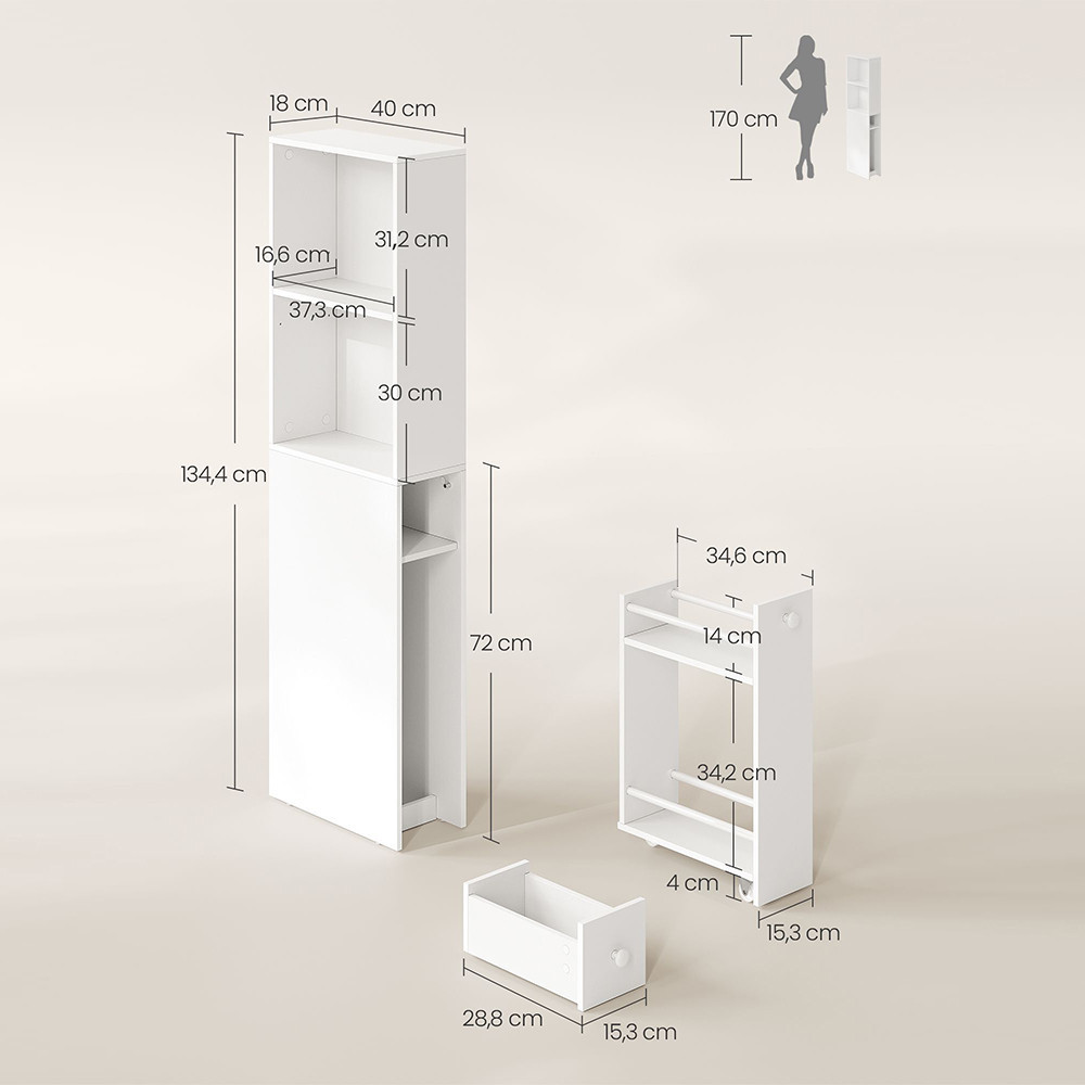 S šířkou pouhých 18 cm je tento kabinet ideální volbou pro úzké prostory, jako je prostor mezi zdí a toaletou. Jeho vysoký a štíhlý tvar maximalizuje vertikální prostor a zabírá minimální plochu na podlaze, což z něj činí praktické úložné řešení pro malé koupelny.