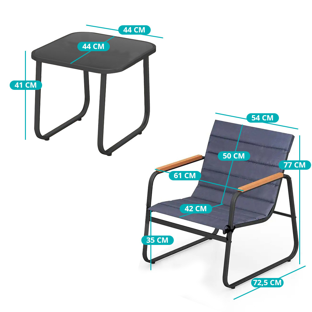 Černý kovový rám, šedé čalounění a dřevěné područky vytvářejí harmonický, moderní vzhled. Čtvercový stůl s zaoblenými rohy je elegantním a bezpečným řešením.