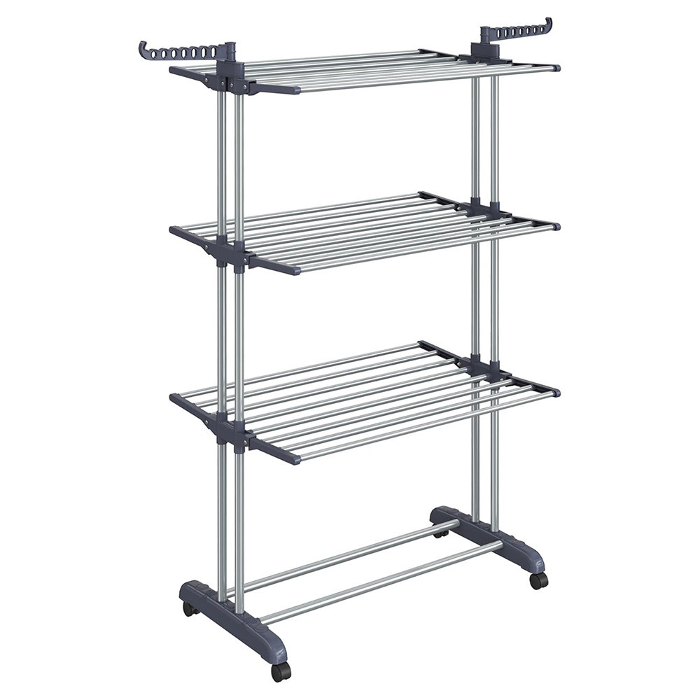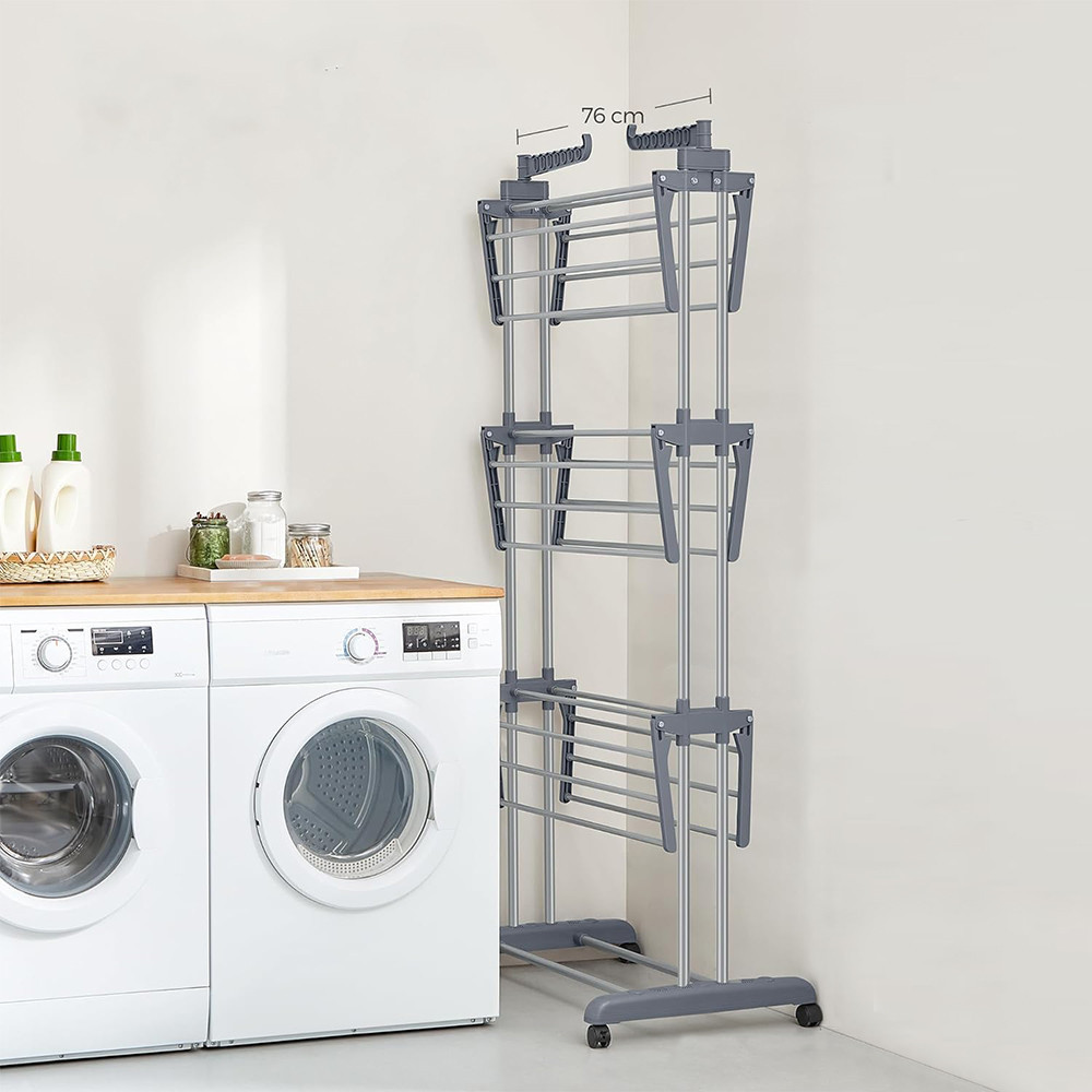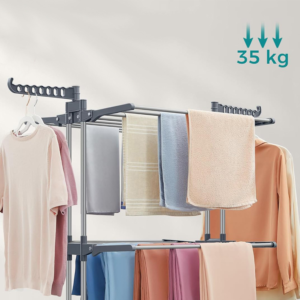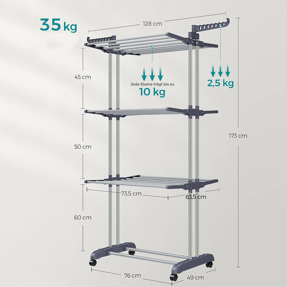 Kovová konstrukce z nerezové oceli a silné plastové spojky poskytují robustní strukturu s nosností 35 kg. Každá úroveň unese až 10 kg, což zajišťuje, že sušák na prádlo bude spolehlivým společníkem na dlouhou dobu.