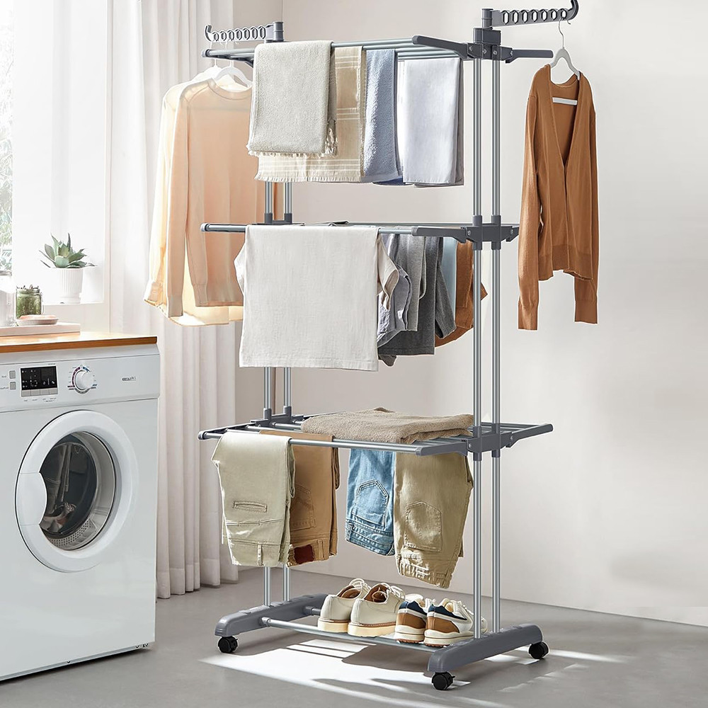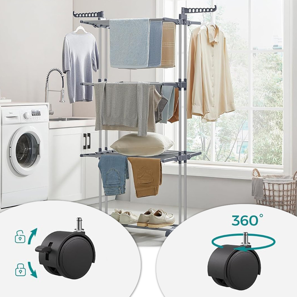 4-úrovňový sušák na prádlo se skládacími policemi je ideálním řešením pro sušení většího množství prádla. Pohodlně pojme ložní prádlo, ručníky, boty nebo více oděvů – a snadno se vejde i do malých bytů.